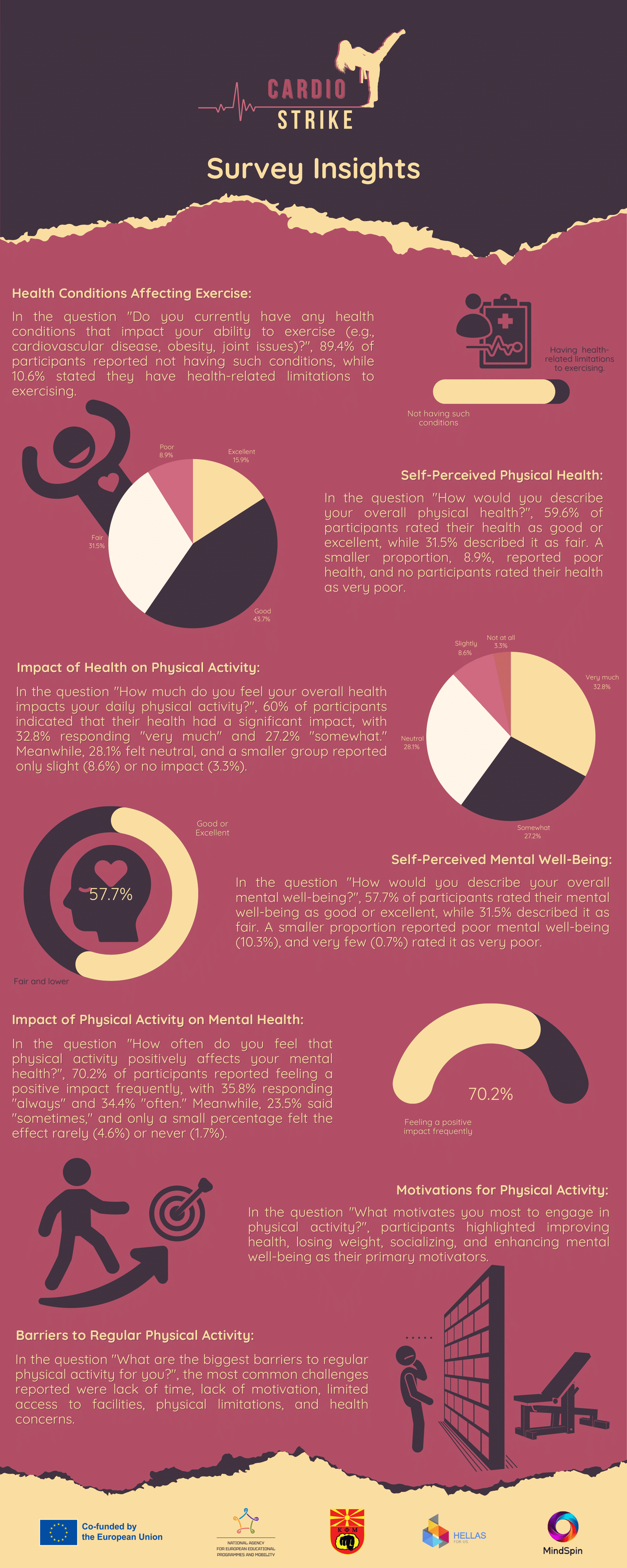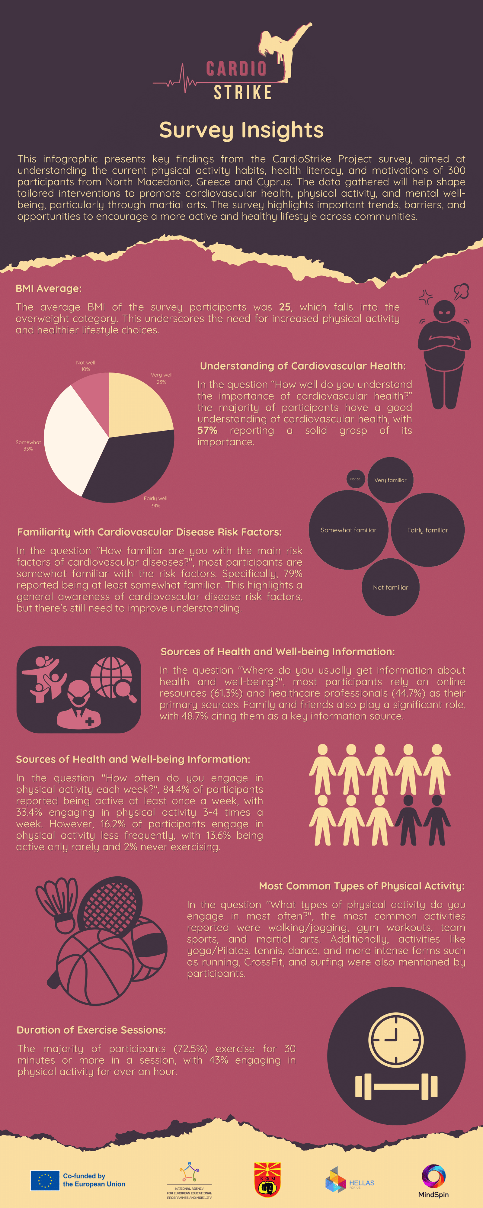 The CardioStrike project team surveyed 300 participants from North Macedonia, Greece, and Cyprus to assess current physical activity habits, health literacy, and motivations for adopting a healthier lifestyle. The findings highlight key trends in cardiovascular health awareness, exercise frequency, and preferred physical activities, with a strong focus on martial arts as an effective tool for promoting well-being. These insights help identify barriers and opportunities for fostering a more active and informed society.